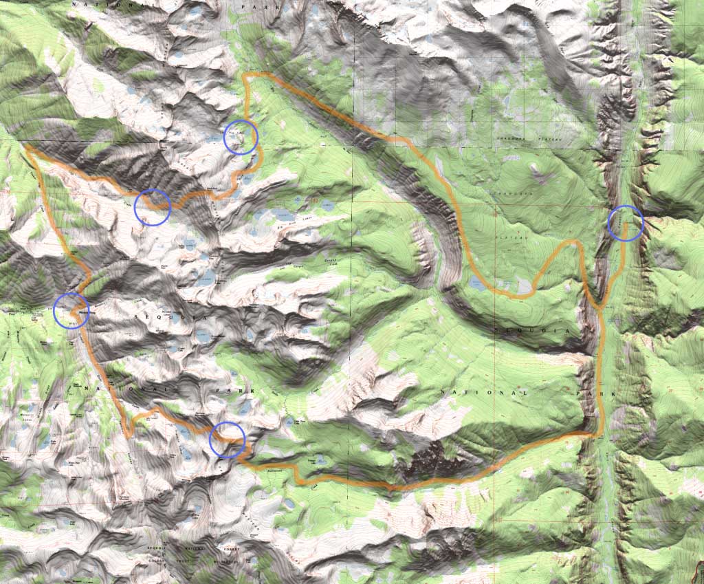 Natural Scene Designer was used here to overlay topographic maps of Sequoia National Park onto matching terrain models. The trail was marked in a paint program, with blue circles showing camp sites.